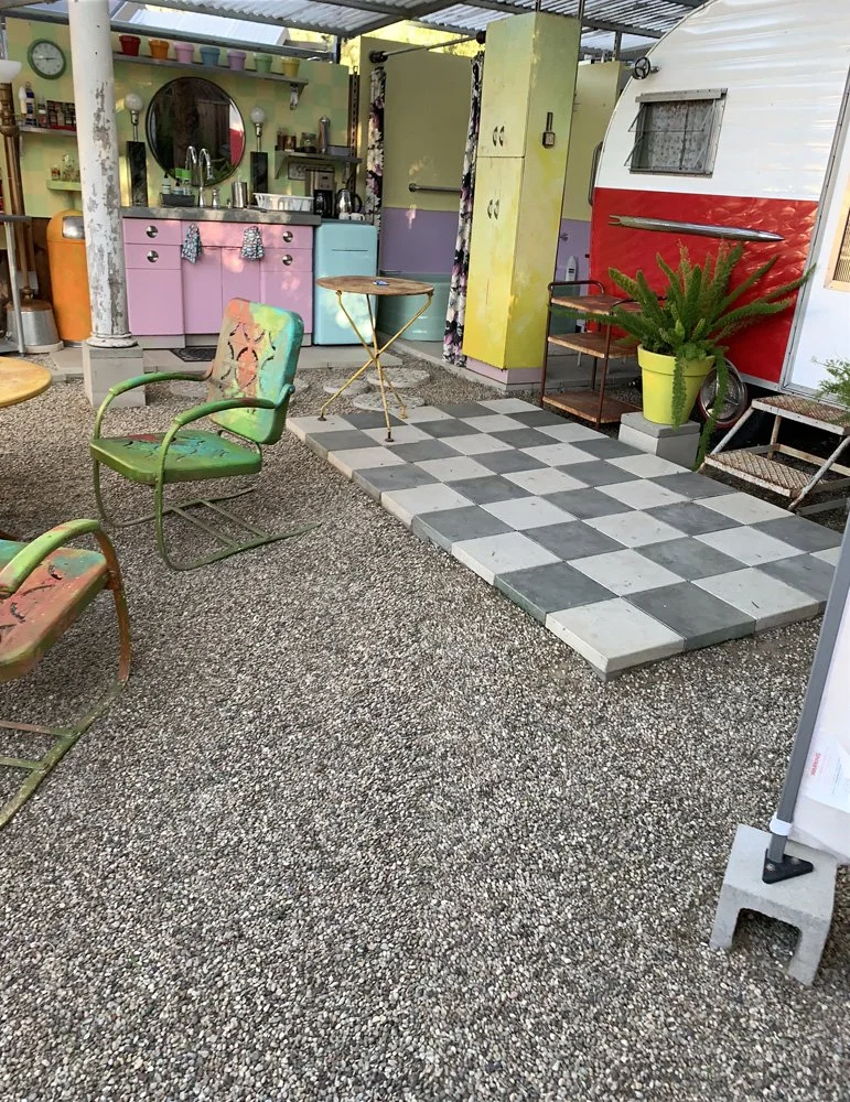 - The outdoor setup includes various "Outdoor Rooms" such as a living room, dining room, kitchen, and bath.