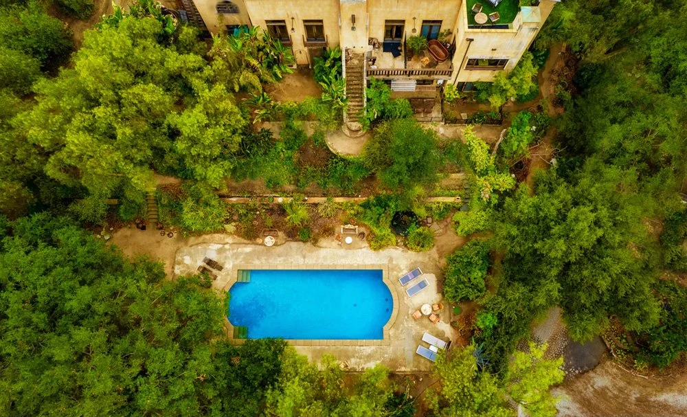 The Mermaid, the centerpiece of the sprawling Mermaid estate, boasts three luxurious rooms including an enchanting rooftop suite, accompanied by breathtaking outdoor tubs, a historic pool, and several other alluring mountainside locations that exude charm and serenity.